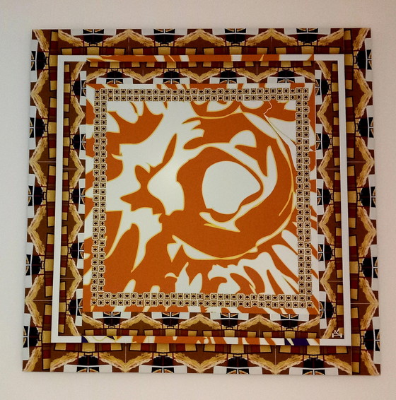 Este dibujo gráfico es una fotografía de una pintura abstracta, "La Espiral del Tiempo", de 2004. Creada con pintura acrílica sobre el cuero de un antiguo gimnasio de la antigua escuela donde trabajaba. Editada digitalmente en 2019 e impresa en aluminio (Dibond) de 800 x 800 mm.