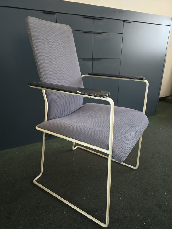 Descubra la elegancia atemporal de este juego de cuatro sillas, diseñado por Walter Antonis para Hennie de Jong y producido por Spectrum. Estas sillas combinan una elegante estructura metálica con una cómoda tapicería textil en un sutil tono gris azulado, perfectas para interiores modernos o retro.