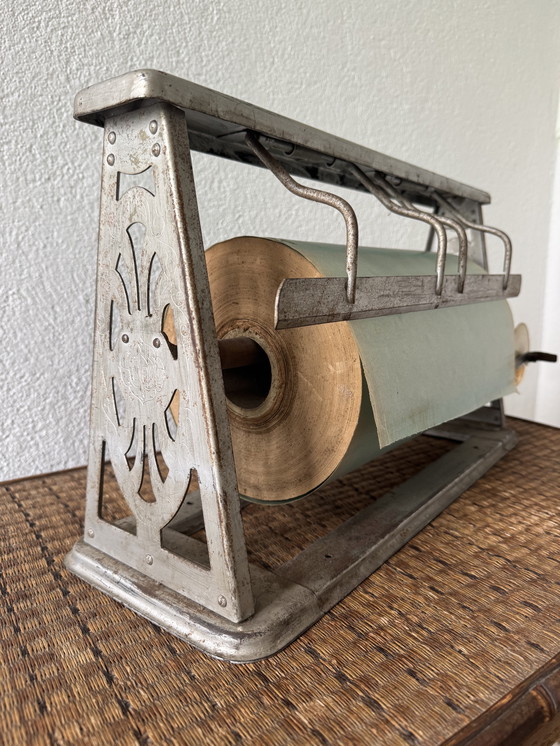 Antiguo dispensador de papel de regalo para tienda o negocio de los años 1900 en estilo Art Nouveau en metal con su rollo de papel de seda original; muy buen estado general; ideal para decoración de escenarios, decoración de tiendas antiguas o para usar como dispensador de toallas de papel... Alto: 29cm Largo: 50cm Fondo: 18,5cm Peso total: 9kg Envío rápido y cuidadoso