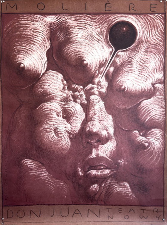 This striking 1983 original Polish theater poster for Molière’s "Don Juan" was created by the celebrated artist Franciszek Starowieyski for Teatr Nowy in Warsaw. Starowieyski’s unmistakable hand is evident in the poster’s surrealist erotic drawing, where baroque flourishes and dreamlike forms swirl around the infamous libertine. The composition is both provocative and enigmatic, with sensuous, exaggerated figures rendered in Starowieyski’s signature monochrome palette, inviting the viewer into a world where desire and morality blur. The poster’s bold, hand-drawn typography and intricate linework reflect the avant-garde spirit of Polish poster art in the early 1980s, a period marked by creative resistance and visual experimentation.