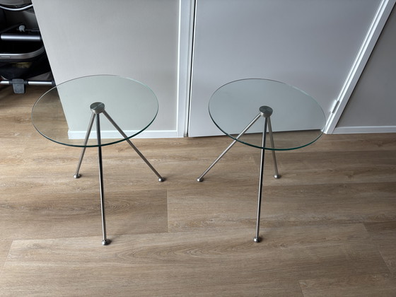 Vea las fotos del juego de dos mesas auxiliares de diseño de cristal.