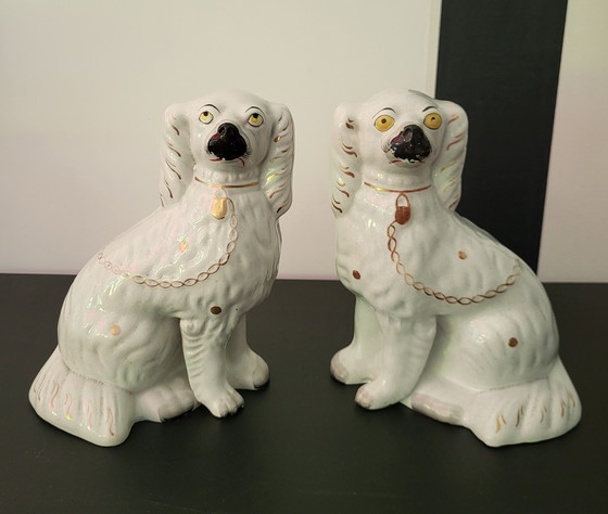 Dos antiguos perros Staffordshire de cerámica inglesa de la primera mitad del siglo XX, en buen estado original, con una fractura visible en el lomo de uno de ellos. ¡Ver fotos para más información! Dimensiones: 26 (alto) x 18 (ancho) x 9 (profundidad) cm. Material: Cerámica. Colores: Blanco, negro, amarillo, dorado y rojo. Origen: Inglaterra.