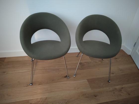 Precioso conjunto de dos sillas Artifort Nina, tapizadas en tela verde , base cromada. Perfectas tanto para el comedor como para el salón. Asiento cómodo. Forma icónica. Usadas pero con muy buen aspecto. Sin daños.
