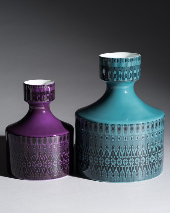 Esta singular combinación de Rosenthal Studio-Line reúne dos jarrones con forma de botella diseñados por Theo Baumann en 1964 —uno en un luminoso turquesa y el otro en un intenso violeta—, ambos envueltos en la precisa decoración geométrica negra de Baumann.