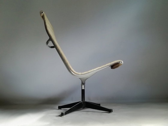 Este sillón giratorio, modelo EA-110, es un icono del diseño, fruto de un largo proceso de desarrollo y parte de una pequeña serie de la primera generación de ALU-GROUP, fabricada antes de que HERMAN MILLER comenzara la producción industrial en masa en EE. UU.