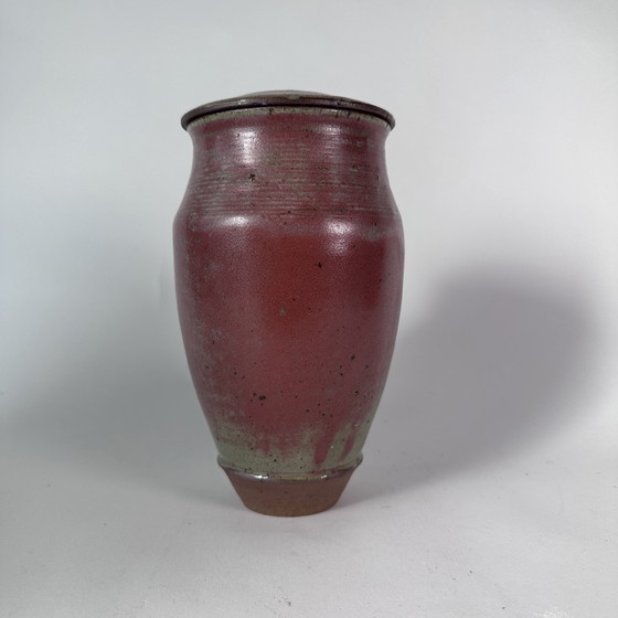 Ed Meissenberg – Jarrón de cerámica de estudio con tapa y esmalte rojo verdoso (década de 1990)