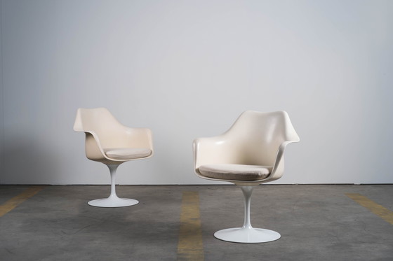 Un conjunto de dos sillones Tulip de principios del siglo XX, diseñados por Eero Saarinen en 1957 para Knoll International. Este conjunto fue producido por De Coene, fabricante oficial europeo de muebles Knoll en aquel entonces. Estas dos sillas fueron de las primeras fabricadas en Europa y originalmente lucieron en el interior del CEO de De Coene. El sillón Tulip es un icono modernista, conocido por su forma elegante y escultural y el uso innovador de materiales. Saarinen quería eliminar el desorden de patas de las sillas tradicionales creando un diseño con una sola pata central. Fabricada con una combinación de fibra de vidrio y aluminio, la silla combina funcionalidad con elegancia futurista. Con el paso de los años, las sillas han desarrollado una pátina natural. El sutil desgaste y la ligera decoloración contribuyen a su encanto y carácter únicos. El precio es por juego. Contáctenos si está interesado en una silla. Se puede realizar el envío a través de Whoppah o mediante nosotros, previa consulta.