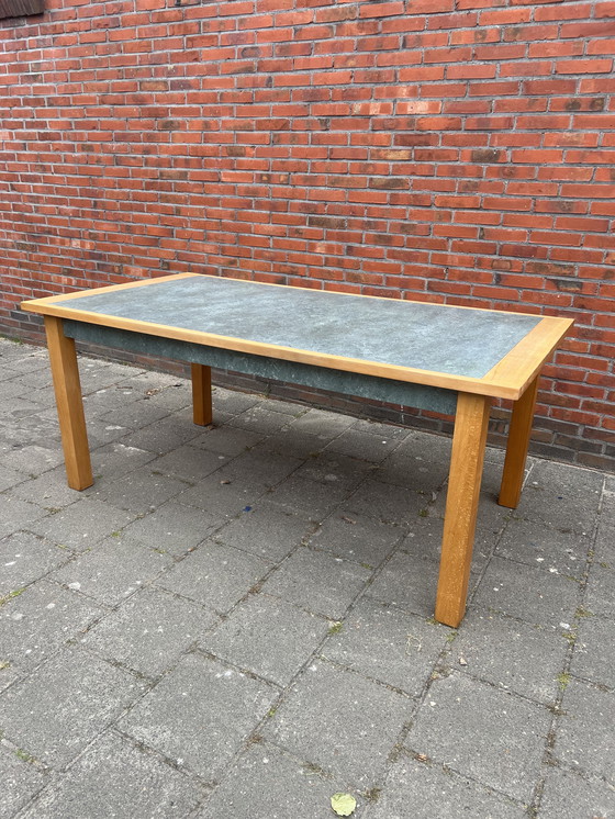 Esta moderna mesa de comedor, diseñada por Richard Hutten, presenta una elegante combinación de madera y linóleo. Tiene una robusta estructura de madera y un tablero de linóleo, lo que ofrece durabilidad y una estética contemporánea. Es perfecta para cualquier comedor que busque un toque de elegancia y diseño moderno.