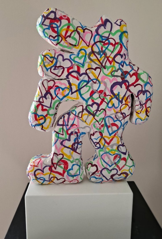 Escultura en técnica mixta. El material elegido es resistente, pintado con acrílicos y barnizado. La obra se basa en el perro de Keith Haring, coloreado al estilo del arte callejero. La pieza es única y auténtica, una pieza única. Firmada en el reverso. El perro de Haring se presenta de forma diferente en cada ocasión. Cada pieza es única y está hecha a mano en el propio taller de Dirk y Marie. Se empaquetan y envían con sumo cuidado. La marca MADOB significa objetos Mad de Marie y Dirk.
