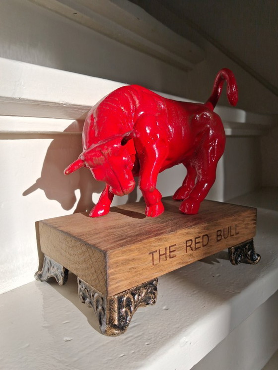 Un toro rojo bellamente elaborado, fabricado en hierro fundido y presentado sobre una robusta base de madera. Un diseño único y realista con detalles.