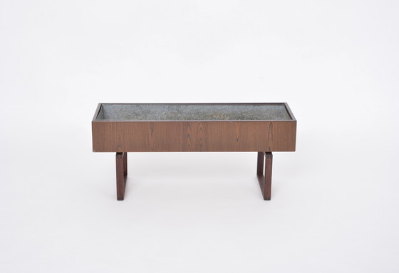Esta jardinera de interior se fabricó en Dinamarca en la década de 1960. Con un diseño elegante, con un toque gráfico y minimalista, se apoya sobre dos patas cuadradas. Está hecha de teca y cuenta con una cuba metálica con incrustaciones.