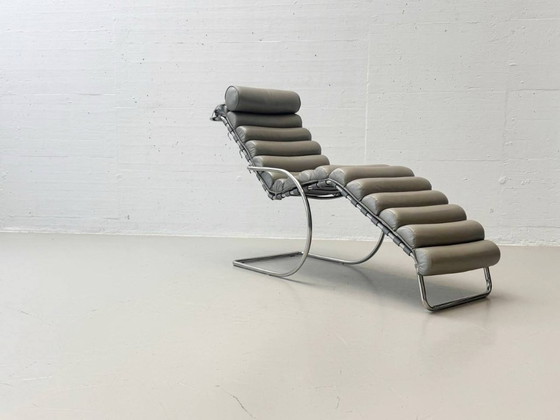 La tumbona está en buen estado de conservación. El armazón cromado muestra sólo mínimos signos de desgaste relacionados con la edad, sin arañazos significativos. La tapicería de piel sintética gris está limpia, sin desgarros ni manchas apreciables, y sólo muestra leves y uniformes signos de uso, que confieren al asiento una sutil pátina. En definitiva, un clásico excelentemente conservado, listo para su uso inmediato.