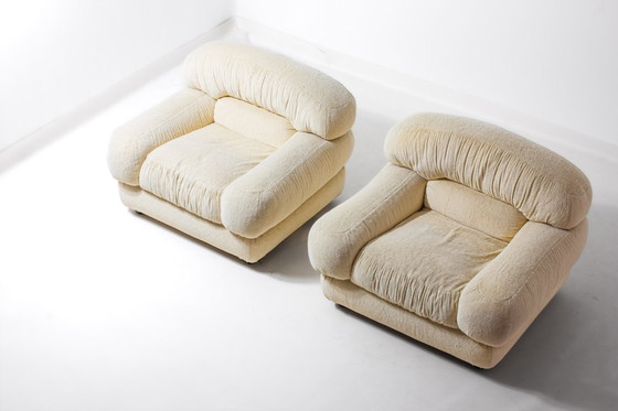 Pareja de sillones italianos de la década de 1970, tapizados en suave tela de felpa color crema. Cuentan con amplios reposabrazos redondeados y un asiento y respaldo generosamente acolchados, lo que los hace espaciosos y muy cómodos. La tela presenta ligeras y uniformes señales de uso propias de su antigüedad, sin roturas ni problemas estructurales. Ambos sillones son sólidos, se ajustan bien y son muy cómodos.