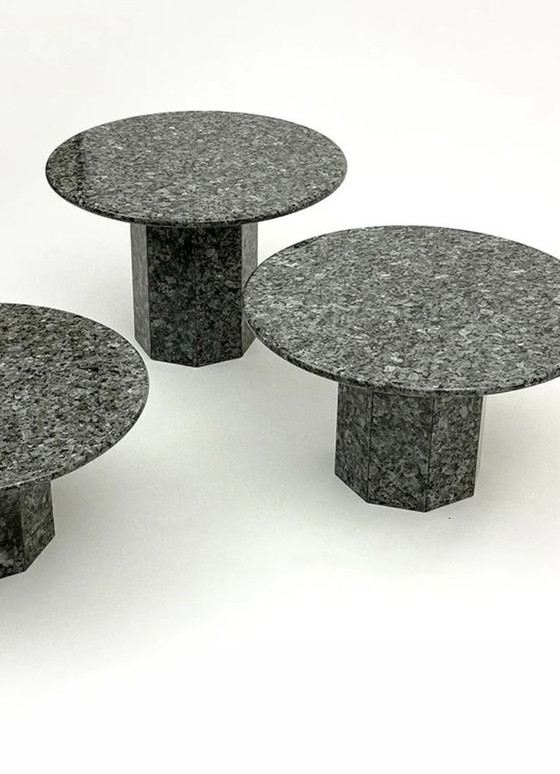Se vende un conjunto de mesas redondas elaboradas con el impresionante mármol de Labrador (también conocido como Labrador Azul Perla). Estas mesas combinan magistralmente la elegancia natural con un diseño geométrico moderno.