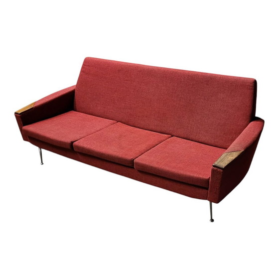 Precioso sillón de diseño vintage de los años 60 con tela original. Altura 70 cm, anchura 176 cm, profundidad 75 cm, altura del asiento 37 cm.