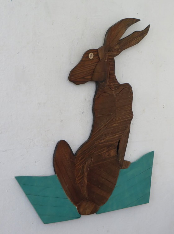 Pieza única de arte mural de madera pintada. Artista Eric van Solm. Formación: Willem de Kooning, Róterdam, 1980-1985, Departamento de Diseño Plástico y Espacial. Registrado en el R.K.D.