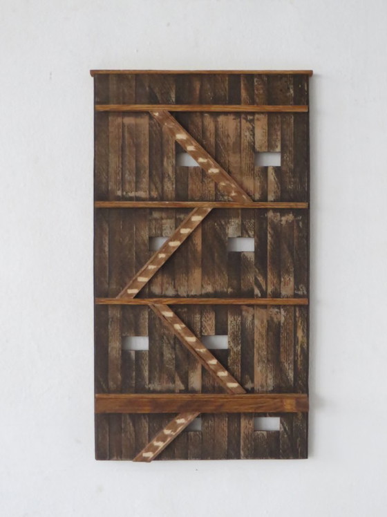 Escultura mural original de madera teñida. Artista: Eric van Solm. Formación: Willem de Kooning, Róterdam, 1980-1985, Departamento de Diseño Plástico y Espacial. Registrado en el R.K.D.