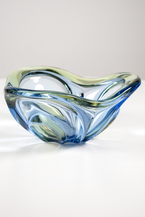 Un cuenco típico de los años 60, hecho de vidrio grueso y transparente con detalles en azul y verde. En buen estado vintage.