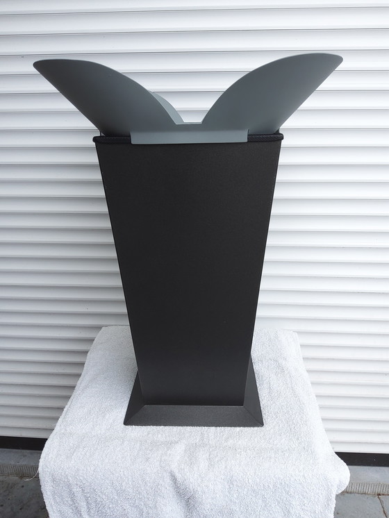 Raro paragüero o cubo de basura. Diseñado por Borek Sipek para Scarabas en la década de 1990. Altura 55 cm, anchura 35 cm. Consta de 2 partes. La parte inferior es de metal negro, cónica con la parte inferior de metal calado, sobre una base de metal. La parte superior es desmontable y tiene forma de cáliz de flor en color gris mate.
