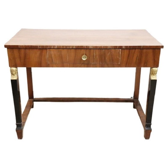 Este escritorio, realizado en nogal fino, se caracteriza por su refinada linealidad. En el frente, dos pilastras negras con un capitel de bronce finamente dorado con cara de cariátide crean un acento visual que capta la atención y añade un toque lujoso.