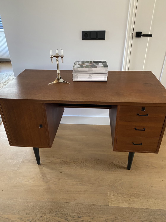 Retroceda en el tiempo con este exquisito escritorio vintage de teca, una pieza esencial para quienes aprecian el diseño moderno de mediados de siglo. Su rico acabado en teca marrón se complementa a la perfección con elegantes patas negras, convirtiéndolo en un elemento destacado para cualquier oficina o estudio. Fabricado con madera de teca de alta calidad, este escritorio garantiza durabilidad y un atractivo atemporal. Cuenta con tres amplios cajones y un armario, ofreciendo un amplio espacio de almacenamiento para todos sus artículos de oficina. Su diseño minimalista y líneas depuradas aseguran que se integre a la perfección en cualquier estilo de decoración. Imagine esta elegante pieza adornando su estudio o sala de estar, sirviendo como un espacio de trabajo sofisticado y una declaración de historia del diseño. No pierda la oportunidad de adquirir esta pieza excepcional. Llaves disponibles.