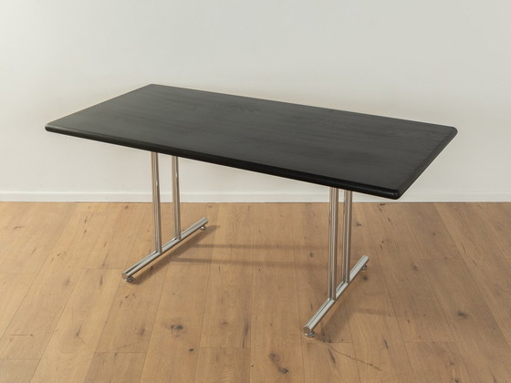 Escritorio clásico de los años 80. Estructura de tubo de acero cromado de alta calidad con tablero de fresno teñido de negro con cantos de madera maciza. Fabricado en Alemania.
