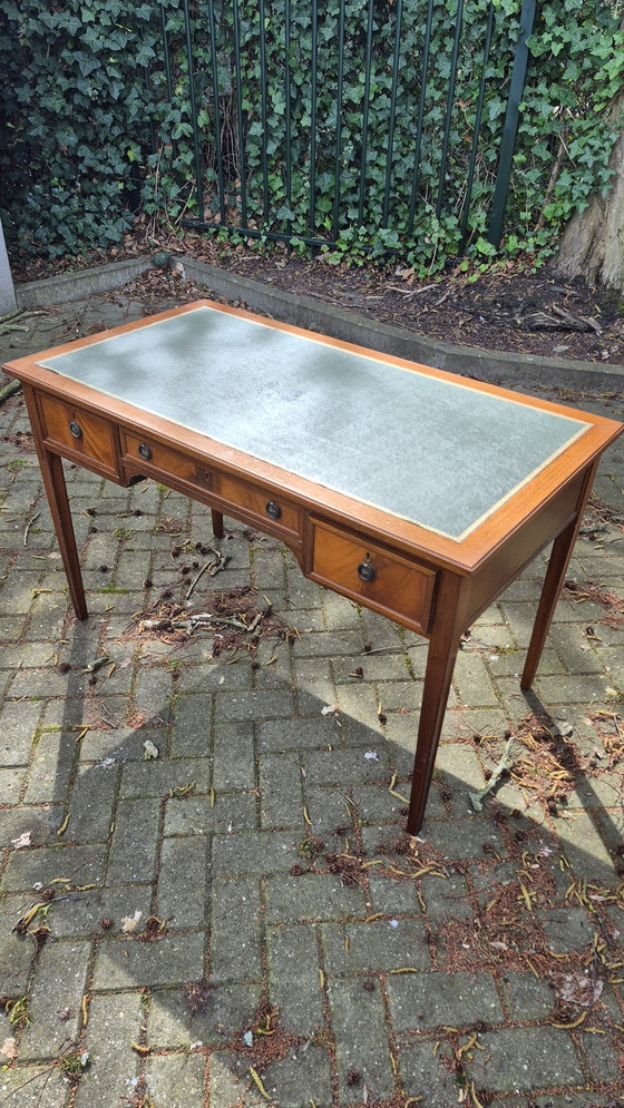 Este elegante escritorio Luis XVI es un elemento esencial para cualquier oficina o estudio. Está fabricado en madera cálida y cuenta con una clásica superficie con incrustaciones de cuero verde. Dispone de varios cajones para un óptimo espacio de almacenamiento y se encuentra en buen estado, con leves señales de uso propias de su antigüedad. Un mueble atemporal que combina funcionalidad y estilo.