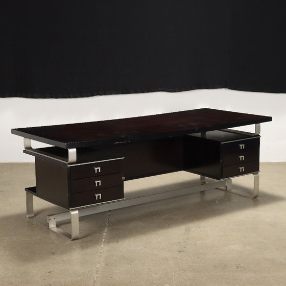 Escritorio grande con cajones laterales en chapa de madera exótica teñida y aluminio cromado.