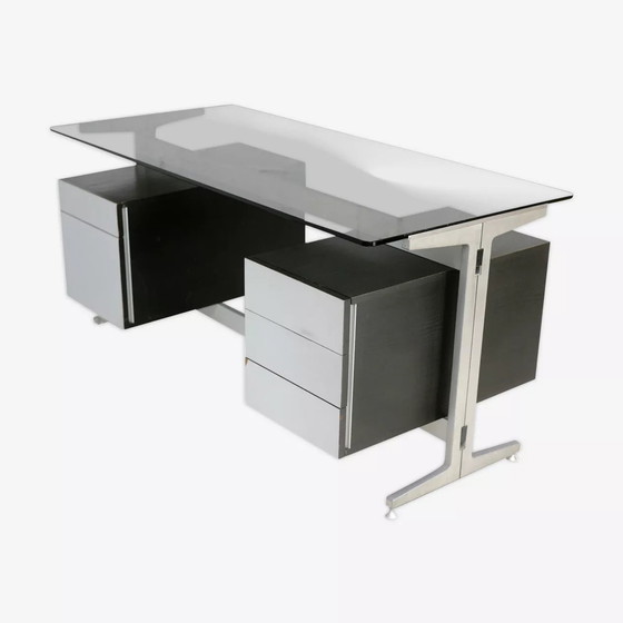 Diseñador: Fermigier, Etienne. Dimensiones: Al. 72 x An. 150 x Pr. 72. Color: Negro. Materiales: Metal. Estilo: Diseño de Etienne Fermigier. Publicado por JFR. Escritorio grande de doble pedestal, madera teñida de negro con revestimiento de acero inoxidable. Francia, circa 1970. Algunas marcas en el tinte de la madera, falta un pequeño trozo de acero inoxidable en los frentes de los cajones. Algunos arañazos. Ver fotos. En buen estado. Diseño de 1970.