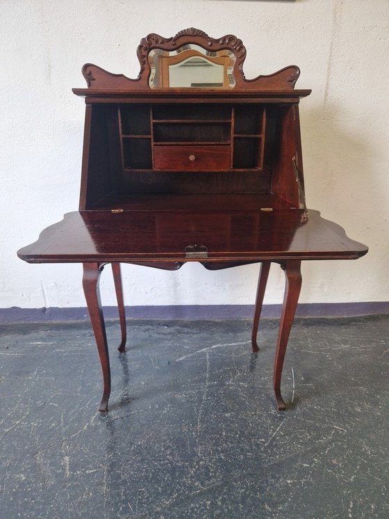 Un secreter Art Nouveau excepcionalmente bello de alrededor de 1890, elaborado en caoba maciza con exquisitos herrajes y finas tallas. La tapa extraíble de espejo con elegantes bordes biselados le confiere un toque especial de sofisticación. La amplia solapa sirve como práctica superficie de escritura y revela pequeños cajones y compartimentos para organizar. Bajo la solapa hay un cajón adicional; ambos compartimentos se pueden cerrar con llave; se incluye la llave correspondiente. Este original inglés impresiona por sus armoniosas proporciones, su artesanía de alta calidad y su elegancia atemporal. Un mueble elegante y lleno de historia, ideal para los amantes de la artesanía clásica.