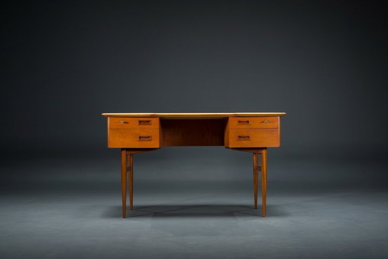 Escritorio vintage de teca atribuido a Musterring, fabricado en la década de 1960. Esta elegante pieza presenta un diseño ligero y espacioso, característico del estilo moderno de mediados de siglo. El escritorio ha sido restaurado profesionalmente en nuestro taller, lo que garantiza un estado casi perfecto, con solo pequeños rastros de la edad y el uso. Una mezcla perfecta de funcionalidad y diseño escandinavo atemporal.