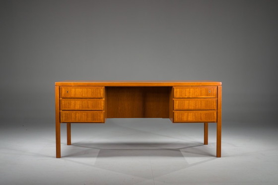 Una pieza audaz e impresionante de la época dorada de la modernidad danesa. Este escritorio ejecutivo Modelo 77 de Omann Jun presenta un imponente diseño geométrico, acabado en rica madera de teca.