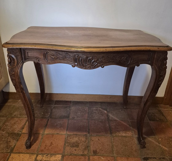 Escritorio francés tallado en nogal, mesa auxiliar, estilo Luis VX, siglo XIX