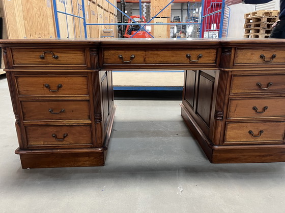 Precioso escritorio indonesio antiguo, hecho a mano, con un estilo clásico. Este espacioso escritorio cuenta con una superficie con incrustaciones de cuero verde y ofrece un amplio espacio de almacenamiento con varios cajones a ambos lados. Sus dimensiones son 180 cm de ancho, 100 cm de profundidad y 80 cm de alto. Ideal para un estudio o despacho en casa. El escritorio se encuentra en buen estado, con leves señales de uso propias de su antigüedad y características.