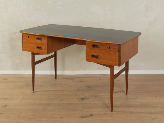 Escritorio independiente de Musterring, de la década de 1950, más delicado. Estructura de alta calidad en chapa de teca con cuatro cajones y patas cónicas de madera. La superficie de escritura está revestida de fórmica negra. Fabricado en Alemania. Borde inferior de la mesa de 74 cm. Ref. 2501001.