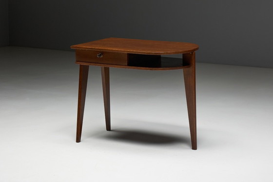 Este elegante escritorio trípode de Jacques Adnet data de la década de 1950 y ejemplifica el refinado modernismo francés. Fabricado en roble con un barniz ligeramente satinado, presenta una silueta minimalista que se combina con una práctica funcionalidad. El escritorio incluye un cajón con su llave original, ambos en perfecto estado de funcionamiento. Su base escultural de tres patas y su almacenamiento integrado lo hacen visualmente ligero y muy práctico. El modelo aparece mencionado en la revista francesa Votre Maison en 1955.