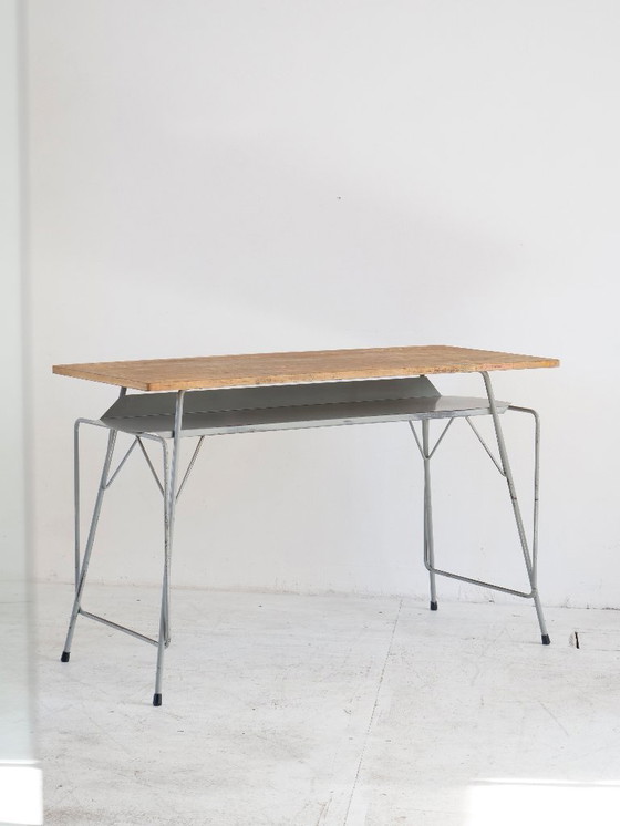Consta de una estructura de metal tubular curvado lacado en gris y un tablero de madera con una hermosa y rica pátina por el uso. Gracias a sus agradables proporciones, es ideal como escritorio, pero también es un complemento llamativo como consola de entrada o mesa auxiliar.