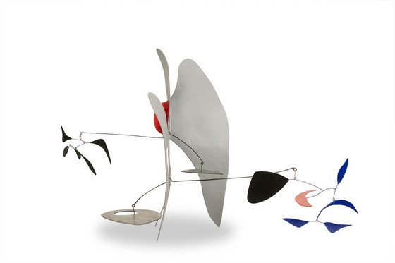 Escultura estable y móvil en metal crudo y lacado en negro, azul y rojo.