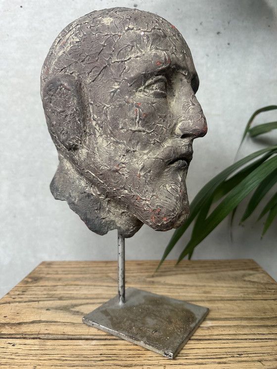Cabeza masculina de terracota sobre soporte de metal. Firmada "Col.H.D.V. ..." y numerada. No podemos determinar el autor de esta expresiva cabeza. Se desmonta fácilmente del soporte. Altura sobre peana: 33 cm. Anchura: 17 cm. Profundidad: 20 cm. Peso: 3 kg.