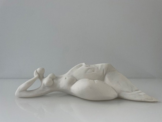 Una escultura estilizada y verdaderamente hermosa de una mujer reclinada. Elaborada en cerámica blanca texturizada. Una elegante obra maestra de excelente calidad, con marca en la parte posterior (autor desconocido). Dimensiones: 28 cm x 9 cm y 7,5 cm de alto.