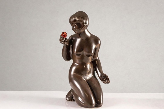 La escultura representa una figura femenina arrodillada que sostiene una rosa estilizada. Está acabada en un esmalte oscuro brillante, que contrasta con el rojo de la flor, realzando la forma y la composición.