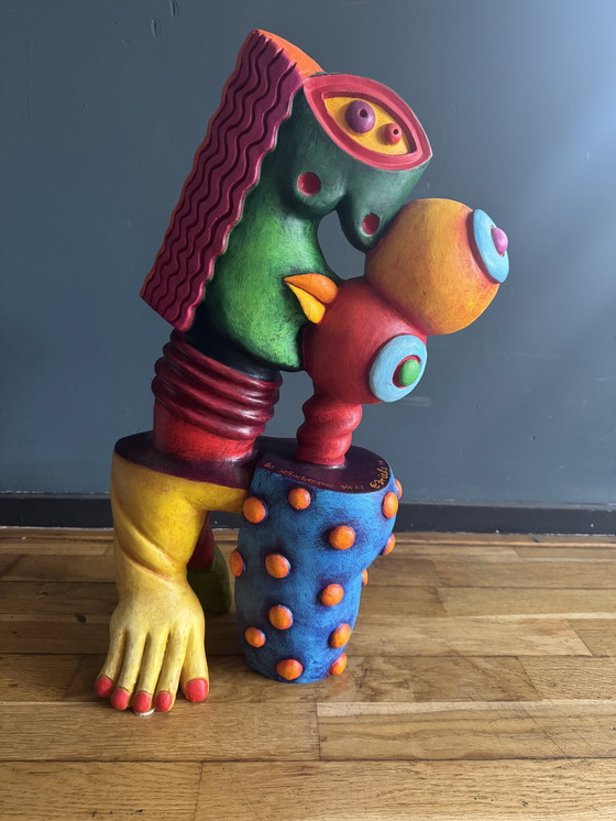 Esta vibrante y colorida escultura, titulada "Les Saltimbanques", de Clemens Briels, presenta un diseño lúdico y abstracto con una mezcla de colores vibrantes, como verde, rojo, azul, amarillo y naranja. Es un ejemplo impactante de arte moderno, que muestra el estilo y la creatividad únicos de Briels. Es perfecta para añadir un toque artístico a cualquier espacio. El objeto está sin pintar.