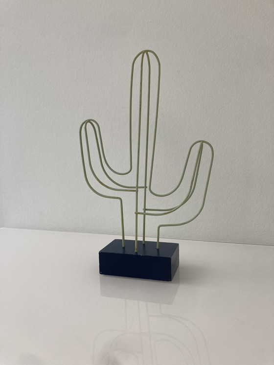 Esta moderna escultura de alambre con forma de cactus es un elegante objeto decorativo que se integra a la perfección en interiores contemporáneos. Hecha de metal con una robusta base de madera, ofrece un aspecto minimalista, elegante y versátil. Ideal para un escritorio, una estantería o el alféizar de una ventana, esta escultura añade un toque de naturaleza y arte a cualquier espacio. Altura (incluida la base): 24 cm. Ancho: 15,5 cm. Profundidad: 6 cm.