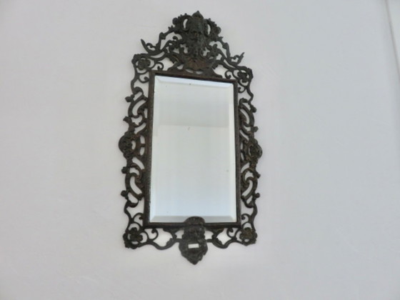 Espejo francés de hierro fundido de las décadas de 1920 y 1930. Representa a Baco, el dios del vino. Es un espejo de pared. Dimensiones: 54 cm x 30 cm. Dimensiones del espejo solo: 17 cm x 29,5 cm. Peso: 3,1 kg. El espejo es muy grueso y está bellamente biselado (con algunas marcas en el plateado). El marco está en muy buen estado.