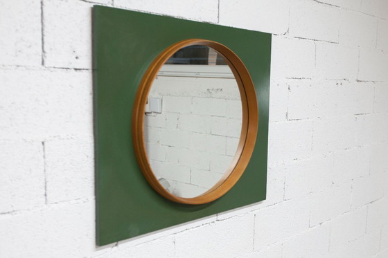 Espejo de pared redondo inusual, 60 cm, borde de teca sobre un tablero rectangular verde, años 60