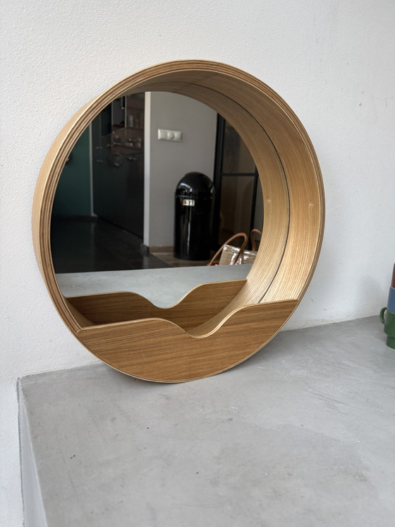 Elegante espejo de pared redondo de la marca de diseño holandesa Zuiver. El marco está fabricado en madera contrachapada con chapa de roble, lo que le confiere un carácter natural y atemporal. El ingenioso compartimento ondulado en la parte inferior ofrece espacio suficiente para pequeños objetos como pintalabios, un peine o las llaves.