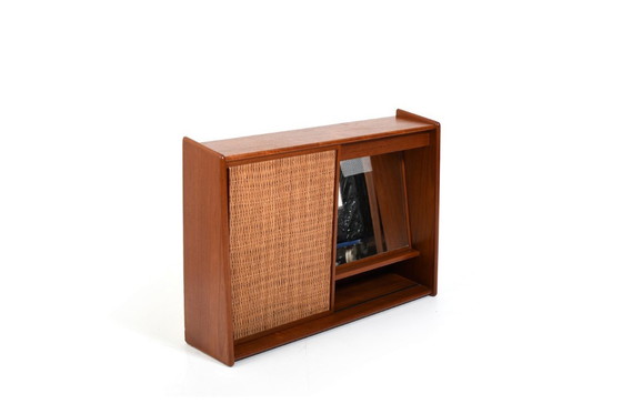 Precioso armario de pasillo danés de mediados de siglo, para colgar en la pared. Diseñado por Arne Wahl Iversen para Brenderup Møbelfabrik, Dinamarca, en la década de 1960. Un lateral tiene una superficie de espejo y el otro un estante. El frontal cuenta con una puerta corredera de ratán. Detrás de la pequeña tira de madera con agujeros debería ir una lámpara. Lamentablemente, ya no está, pero se puede reemplazar fácilmente.