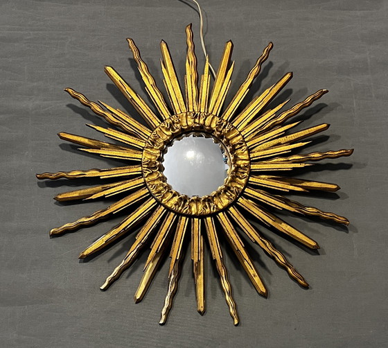 Espejo de sol de madera de doble cara con espejo convexo y lámpara, años 60. Montado en la pared.