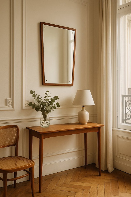 Espejo escandinavo fabricado en Suecia en la década de 1950. Espejo montado sobre tablero de teca. En excelente estado, con mínimas señales de desgaste, propias de su estado vintage. 13492