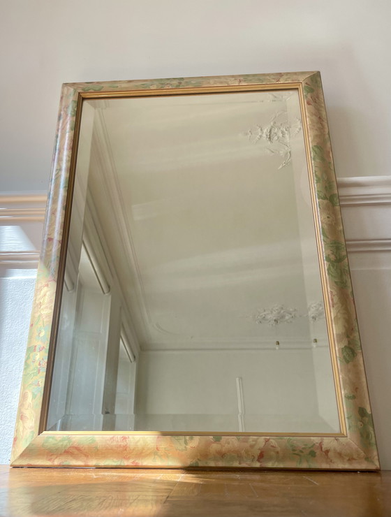 Este espejo biselado vintage es una auténtica magdalena de Proust. Adornado con delicados motivos florales pintados en suaves tonos rosas y verdes, aporta un toque poético y romántico a su hogar.